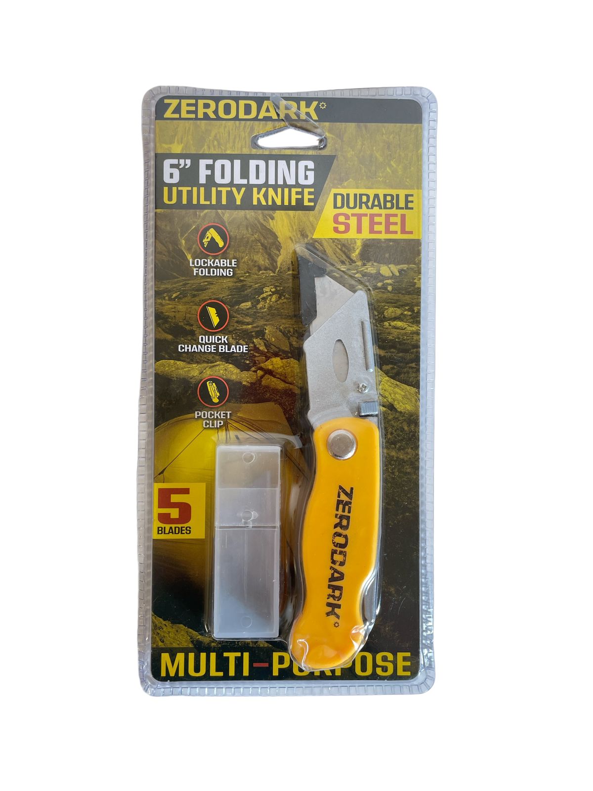 El Folding Utility Knife de 6 pulgadas de la marca ZeroDark es un cuchillo plegable multiusos fabricado en acero durable. Cuenta con sistema de bloqueo, clip de bolsillo y cambio rápido de hojas. Incluye un set de 5 hojas adicionales.