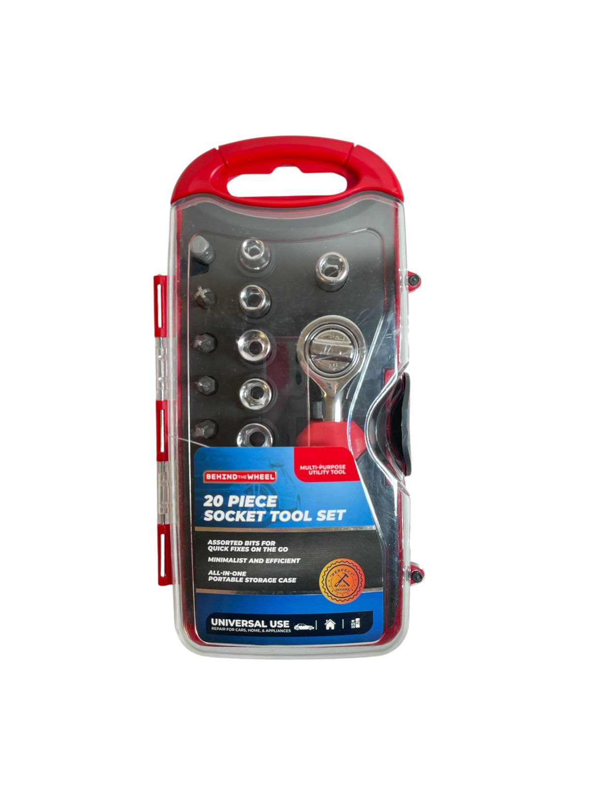 El Socket Tool Set de 20 piezas de la marca Behind the Wheel incluye dados y puntas variadas para reparaciones rápidas y eficientes. Viene en un estuche portátil de almacenamiento, ideal para llevar en el auto, casa o taller.